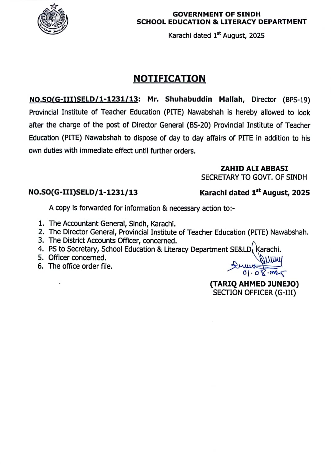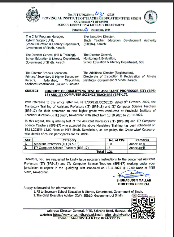 This is an official instruction from the Sindh School Education Department, which PITE is required to follow.